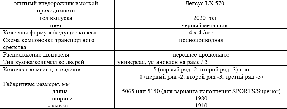 Согласно техспецификации, речь идет об аренде внедорожника Lexus LX 570 2020 года выпуска. Примечательно, что конкретная модель автомобиля в технических характеристиках встречается нечасто.