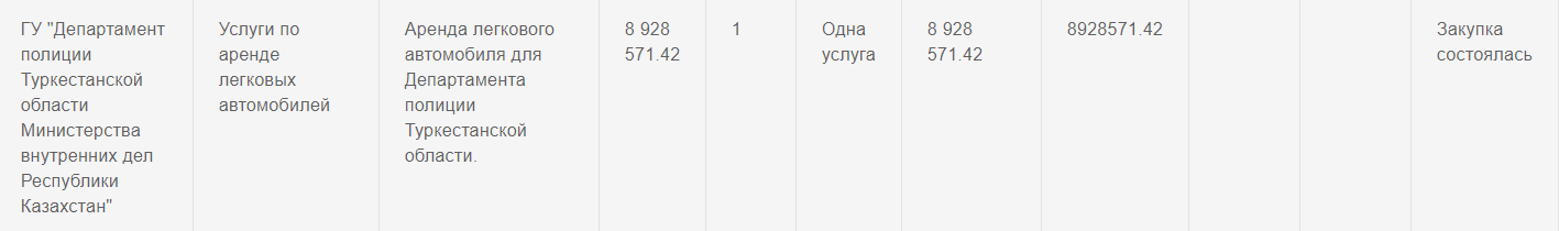 Автопарк обновили и другие госведомства. Например, департамент полиции Туркестанской области опубликовал тендер на 8 928 571 тенге ради аренды легкового автомобиля для нужд правоохранительных органов.