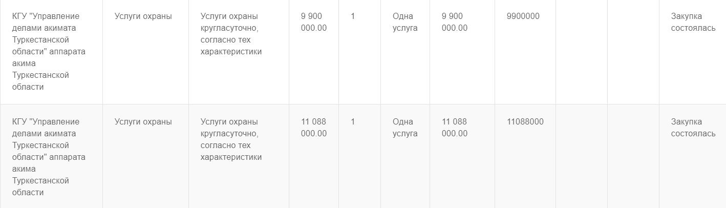 Помимо этого, управление делами акимата Туркестанской области также позаботилось и о безопасности администрации региона. Сотрудники ведомства опубликовали лот на 9 900 000 тенге и на 11 088 000 тенге для закупки услуг охраны.