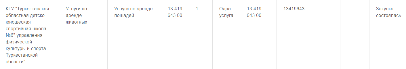 Интересно, что в Туркестанской области арендуют не только элитные внедорожники или невооруженную охрану на 20 миллионов тенге, но и животных. Туркестанская областная детско-юношеская спортивная школа №6 опубликовала тендер на услуги по аренде лошадей. На эти нужды выделили 13 419 643 тенге