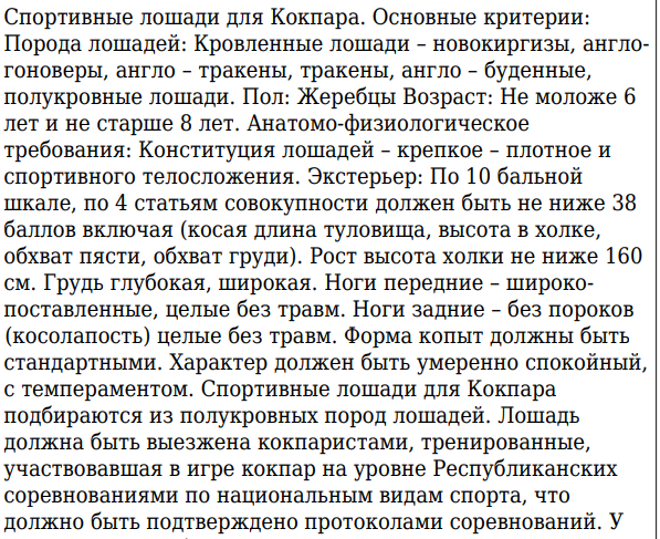 Согласно техспецификации, спортивное учреждение арендует лошадей для национальной спортивной игры кокпар. В связи с этим заказчики даже подробно расписали необходимые породы лошадей, возраст, физические характеристики и уточнили, что речь идет о натренированных лошадях, которые уже неоднократно участвовали в подобных соревнованиях.