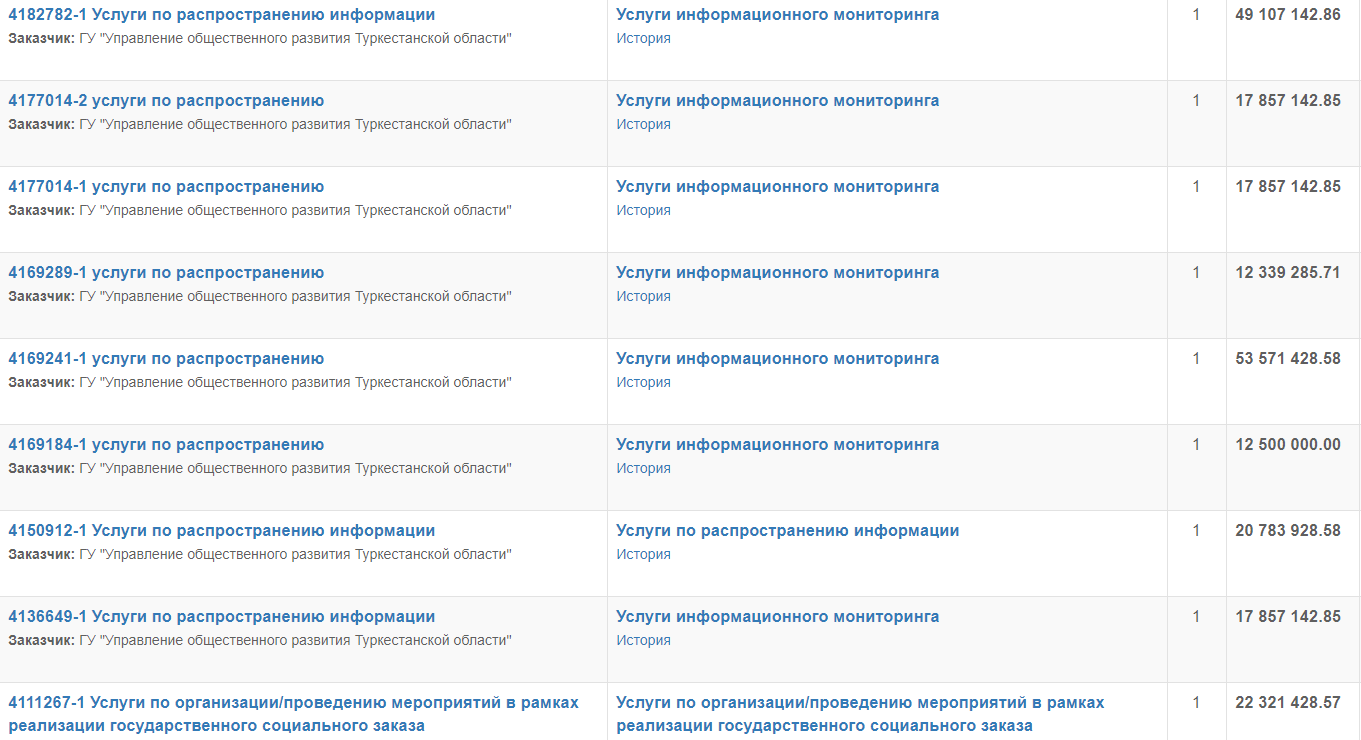 К примеру, только на один тендер, направленный на распространение позитивных материалов о работе акима, местных маслихатов и прочей администрации, выделяется 53 571 428 тенге. Однако лот сейчас находится в статусе изменения документации.