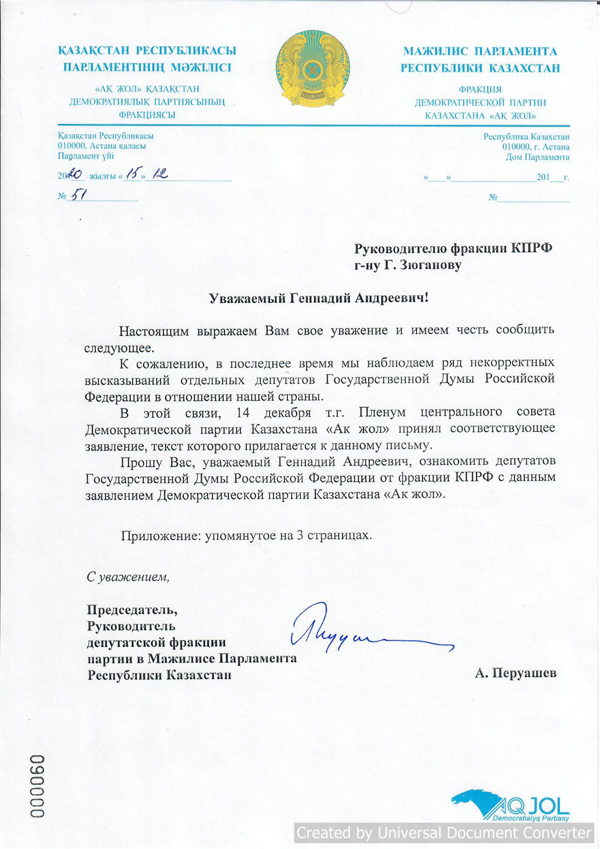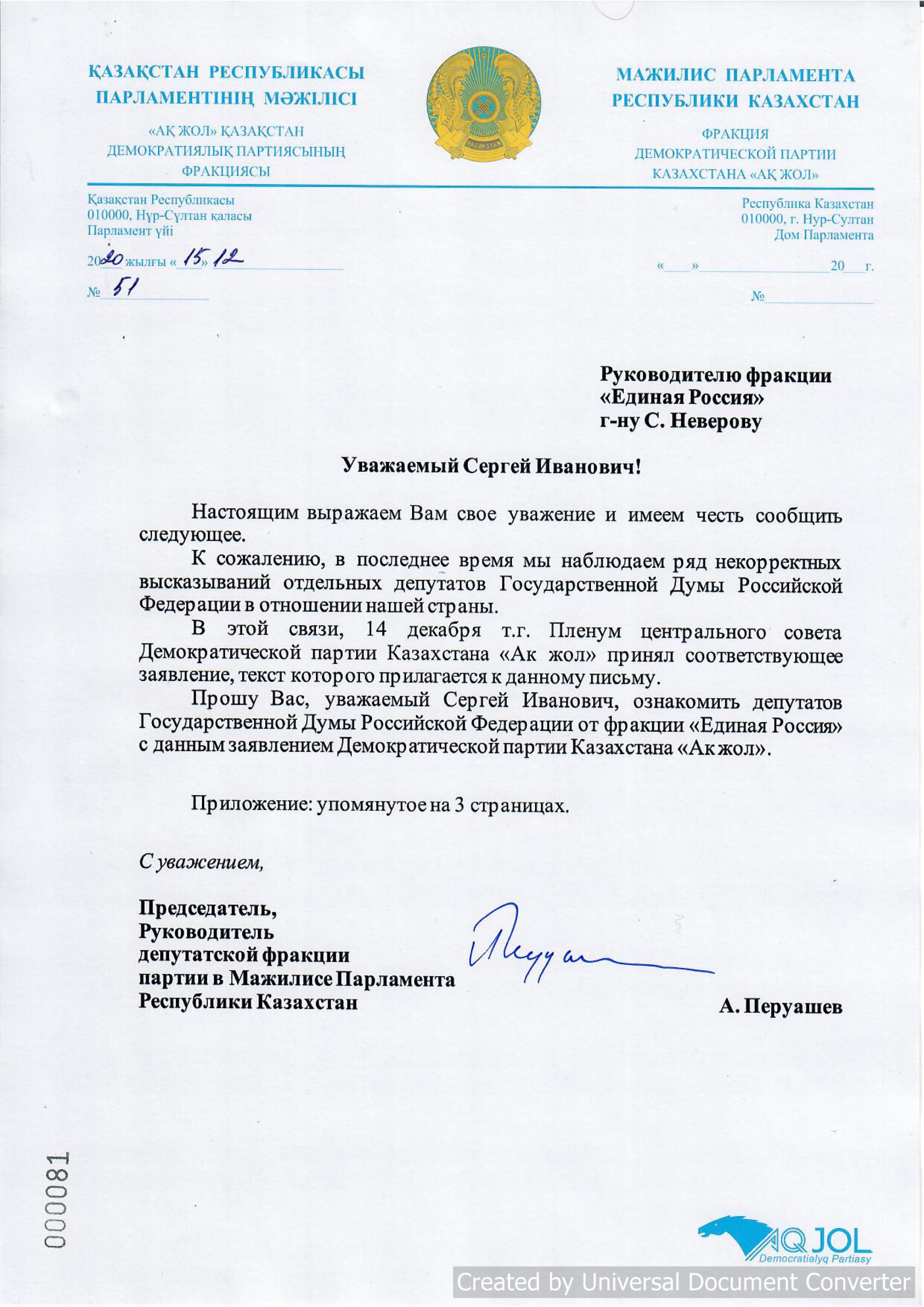 "Полностью присоединяясь к этой позиции, Демократическая партия Казахстана «Ак жол» и её депутатская фракция в Парламенте Республики отмечают не только недопустимую тональность таких провокаций, но и искажение ими исторической действительности, а также полное игнорирование норм международного права." — отмечается в сообщении.