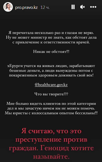 "Я перечитала несколько раз и глазам не верю. Ну не может министр не знать, как обстоят дела с привлечением к ответственности врачей. Никак не обстоят!