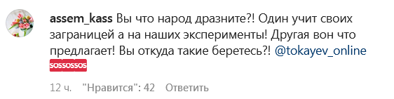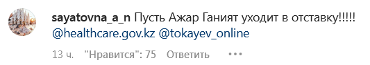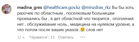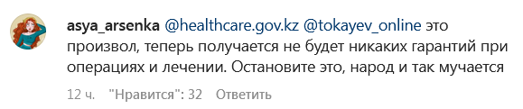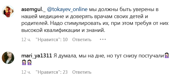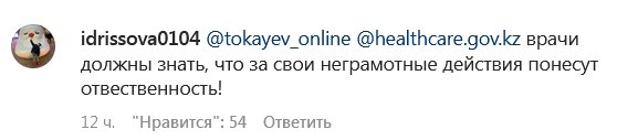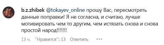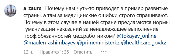 "Вы, как юрист, прочитайте, пожалуйста, внимательно законопроект! Там даже 317 статью Уголовного кодекса не убрали! Уменьшение срока наказания на один год, вы считаете, что это кошмар? Медицинская общественность, например, наоборот, говорит, что законопроект не защищает их", — написала пользовательница с ником zarina_kamassova.