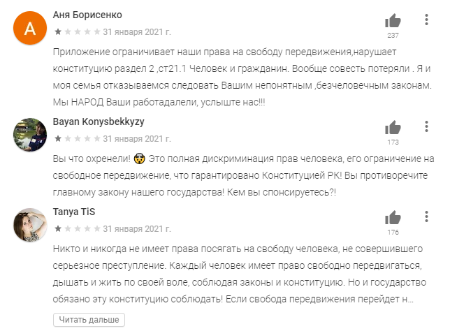 После того как эта информация была растиражирована СМИ, казахстанцы начали массово жаловаться на нарушение своих прав из-за нового приложения, разработанного министерством цифрового развития, инноваций и аэрокосмической промышленности. Граждане пишут свое мнение в Сети. Многие считают, что разделение по цветам — красный, желтый, синий, зеленый — и пропуск в ряд заведений по QR-коду противоречат Конституции.