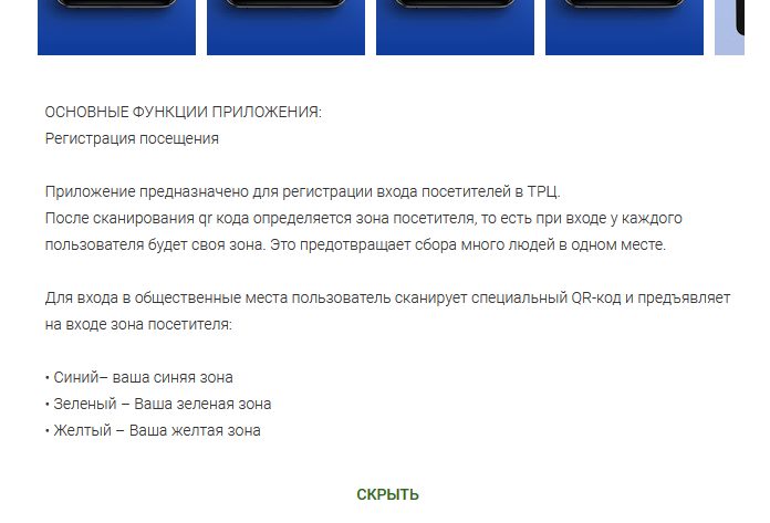 В самом приложении описано совсем иное. Там говорится, что цель приложения — регистрация посещений. Никакого понятия “допуска” или “контроля над эпидситуацией” нет. То есть главная задача сделать так, чтобы люди не скапливались в одном месте. Там указано, что есть три зоны: синяя, зеленая и желтая. То есть, если человек заходит в супермаркет, ему предлагают проследовать в зону соответственно его цвету.