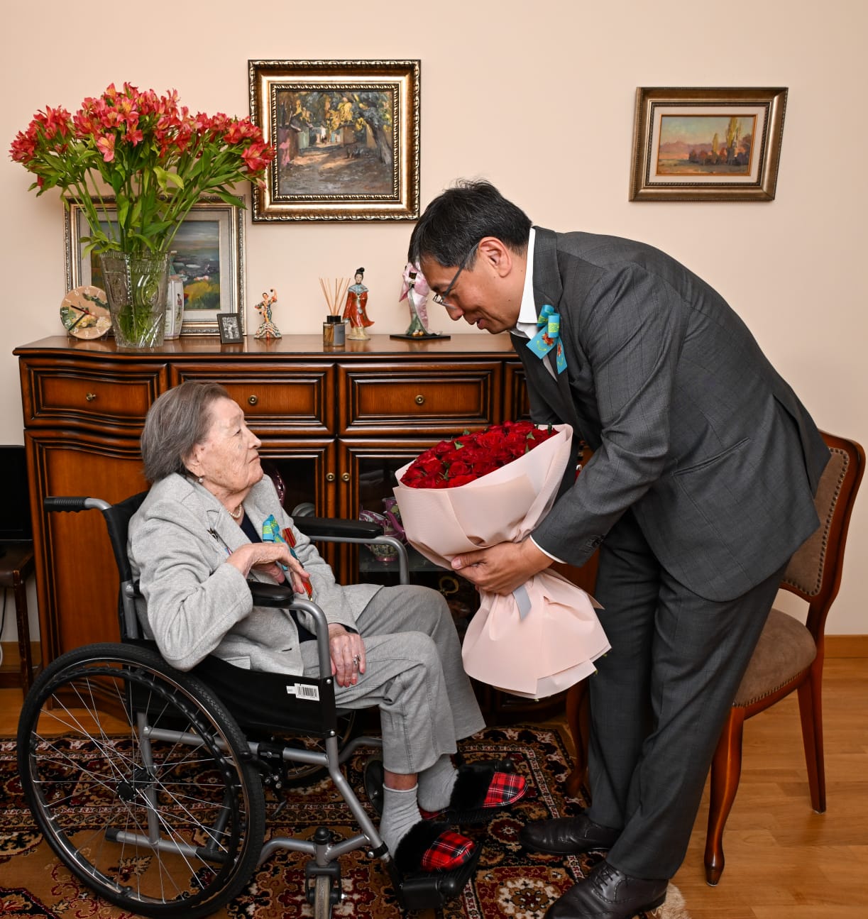 «Иван Матвеевич, для меня большая честь приветствовать Вас. Очень надеюсь, что в следующем году поздравлю Вас лично со 100-летним юбилеем. Преклоняемся перед Вами и благодарим за вклад в Великую Победу. Спасибо за то, что Вы у нас есть», — сказал Ерболат Досаев.