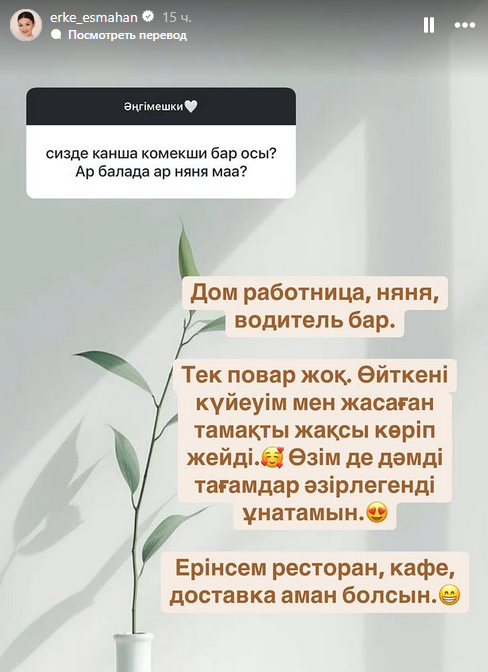 «Есть домработница, няня, водитель. Нет только повара, потому что муж любит еду, которую я готовлю. Мне и самой нравится готовить вкусные блюда. Если ленюсь, то ходим в рестораны и кафе, заказываем доставку», — ответила Ерке.