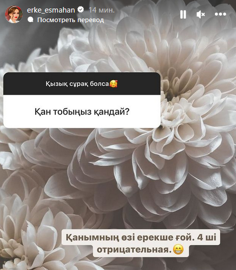 Подписчики задавали Ерке вопросы, передает Caravan.kz. Одним из них был вопрос о том, какая у артистки группа крови.