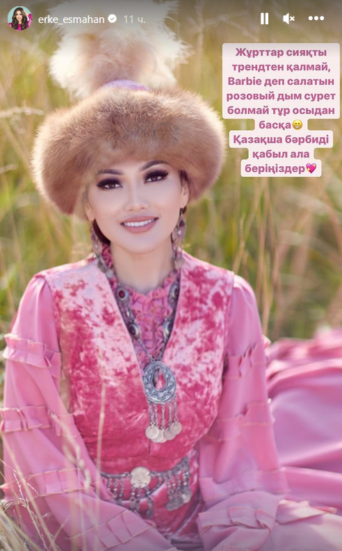"Как и все, не хочу отставать от тренда. Хотела опубликовать фото в розовом цвете, чтобы выглядеть на нем, как Барби, а других нет, кроме этого снимка. Принимайте казахскую Барби", — написала певица.