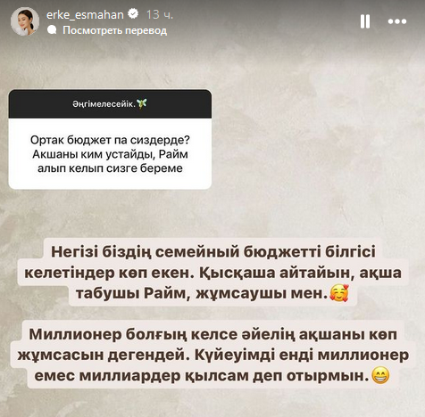 Говорят, что если хочешь стать миллионером, нужно позволить своей женщине много тратить. Так что мой муж не миллионером, а миллиардером должен стать", — ответила Ерке.