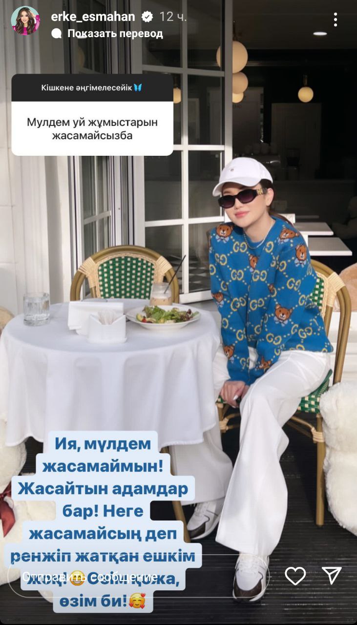 "Да, совсем ничего не делаю! Есть люди, которые делают. Никто не обижается, не спрашивает, почему я ничего не делаю. Я сама себе госпожа", — ответила Ерке.