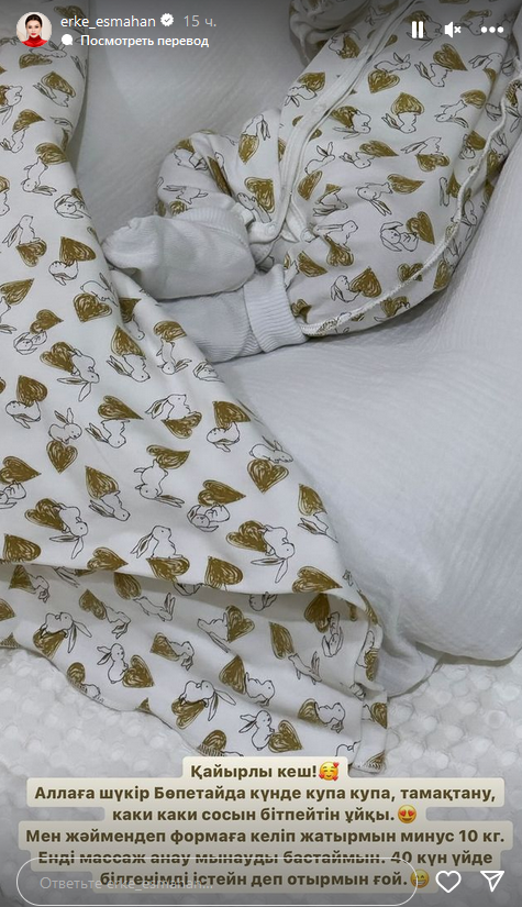 "У малыша каждый день купания, еда, потом сон. Я понемногу прихожу в форму, минус 10 кг. Теперь начинаю массаж и всякое прочее. Думаю о том, чтобы провести 40 дней ребенка дома", — написала певица.