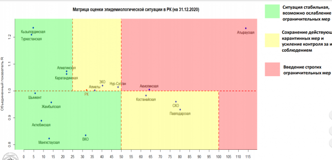 Согласно матрице оценки эпидситуации, Казахстан на 31 декабря находится в "желтой" зоне.