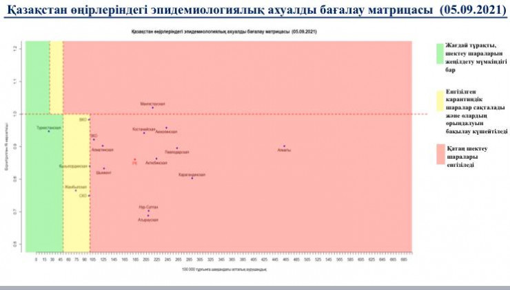 В "красной" зоне: города Нур-Султан, Алматы, Шымкент, Акмолинская, Актюбинская, Алматинская, Атырауская, Западно-Казахстанская, Карагандинская, Костанайская, Мангистауская, Павлодарская области