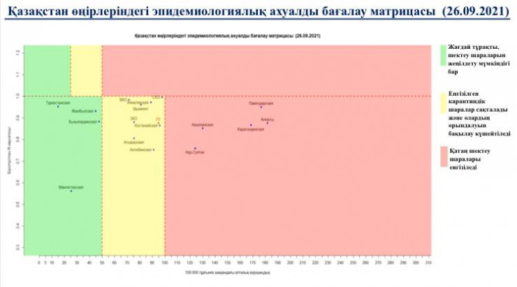 Об этом свидетельствуют данные матрицы оценки эпидемиологической ситуации в регионах Казахстана на 26 сентября 2021 года, сообщает медиа-портал Caravan.kz.