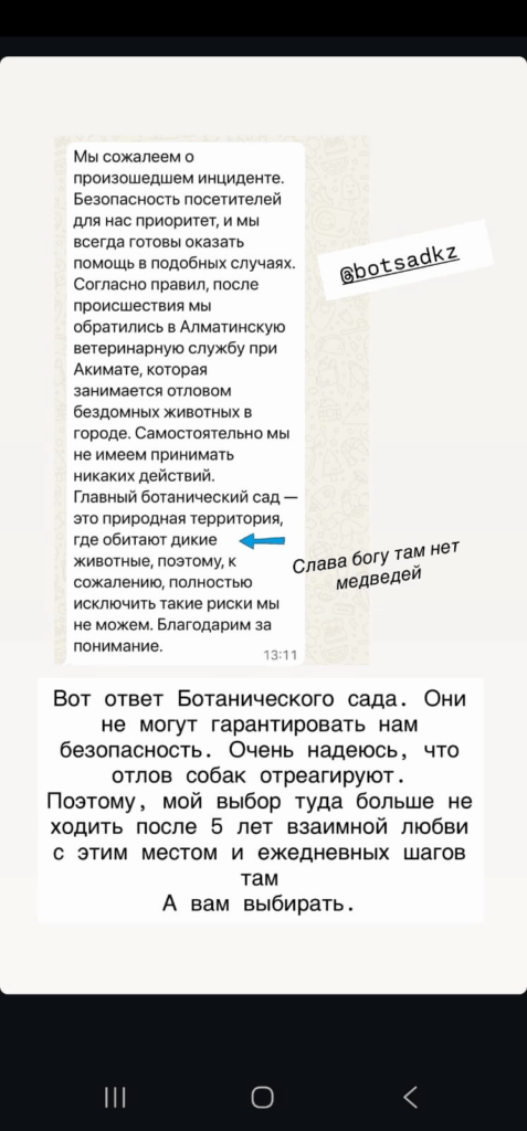 Также Ирина поделилась ответом администрации ботанического сада, пришедшим на её обращение. В нём говорится о том, что сотрудники обратились в алматинскую ветеринарную службу, а самостоятельно ничего сделать в этой ситуации не могут: