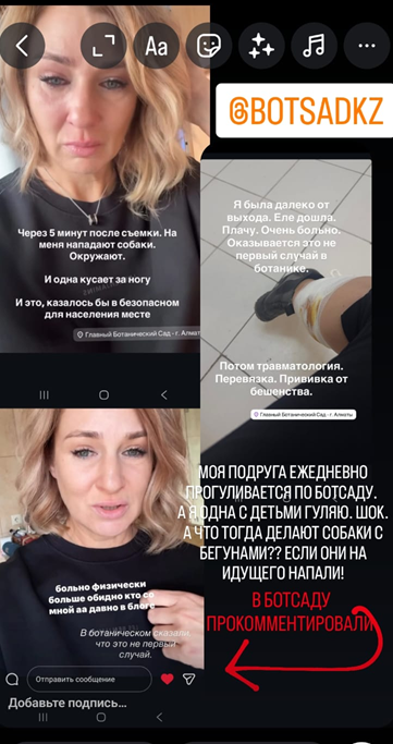 Жительница Алматы Ирина Белова заявила в сториз в Instagram о том, что в Ботаническом саду её укусила бродячая собака., сообщает Caravan.kz.