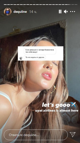 Вскоре после этого в сториз Dequine показала, что ей уже пишут про то, что ее поведение находят возмутительным: "Если девушки с запада Казахстана так себя ведут, чего ждать от других?". Певица в ответ на это пошутила: "Начинаем! Авиалиния-уят уже почти здесь!".