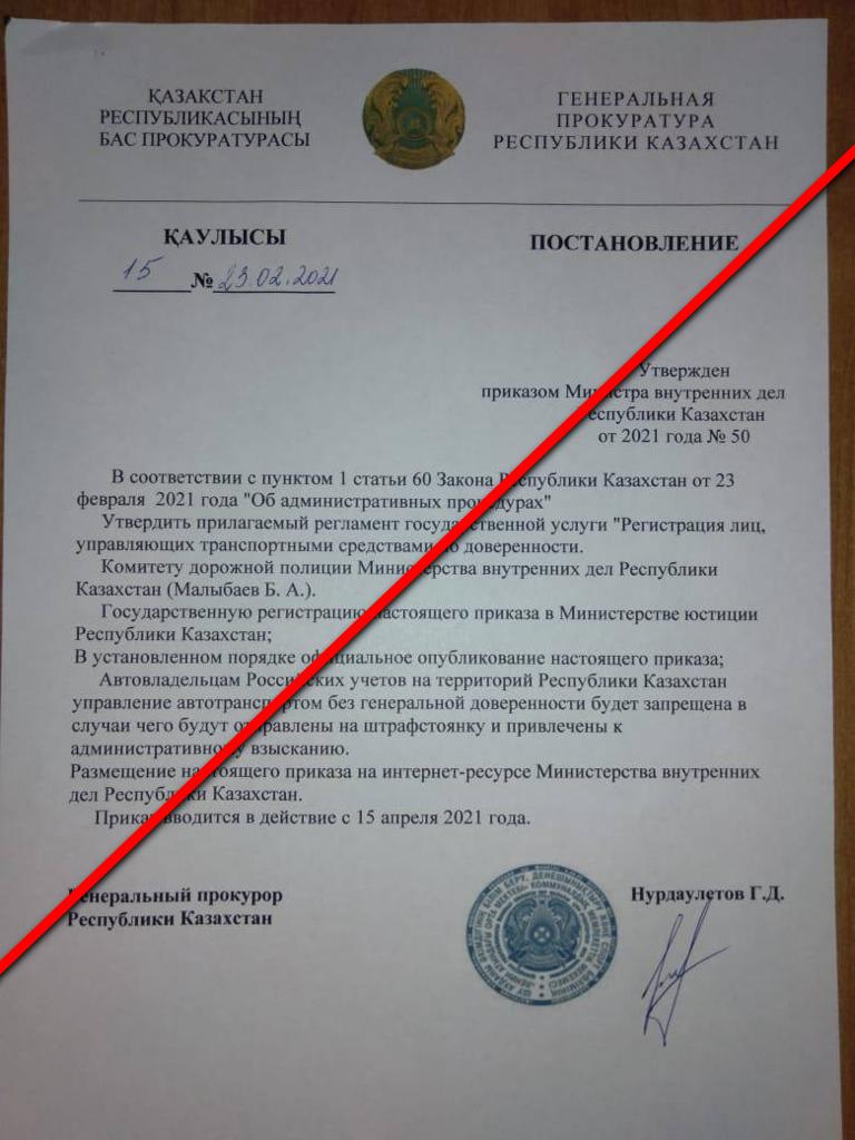 Казахстанцы пересылают друг другу фотографию документа, который якобы запрещает владельцам машин, поставленным на учет в России, ездить без генеральной доверенности на территории РК, сообщает медиа-портал Caravan.kz со ссылкой на Stopfake.kz