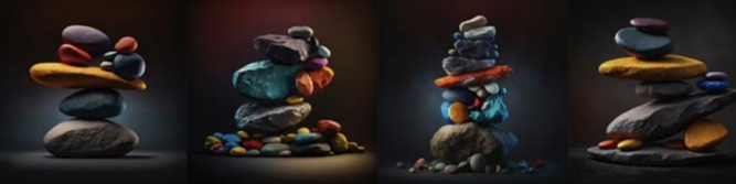 Кирилл очень интересуется созданием необычных художественных портретов, натюрмортов, природных пейзажей. Первой задачей было посмотреть на результаты создания яркого натюрморта с помощью AI. Кирилл подчеркнул, что создание пирамиды из цветных камней может занять много времени в реальной жизни: поиск подходящих камней, их покраска и сборка. AI смог предложить несколько вариантов за минуту.