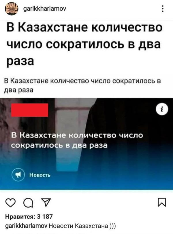 И если последняя шутка связана с плохими новостями, которые россияне получали в последние полгода, то в прошлом году российский комик обратил внимание на новость, которую тогда опубликовали для казахстанцев. Заголовок в одном из казахстанских СМИ настолько позабавил Харламова, что он перепостил его себе в Instagram. Название звучало как "В Казахстане количество число сократилось". Харламов коротко прокомментировал это: "Новости Казахстана", и в комментариях к активизировались другие юмористы. Среди самых интересных высказываний: "Зато качество цифра увеличилось!", "Количество чисел сокращается ежемесячно. Сколько можно это терпеть?!", "Когда муж спрашивает, куда дела деньги, включаю Казахстан".