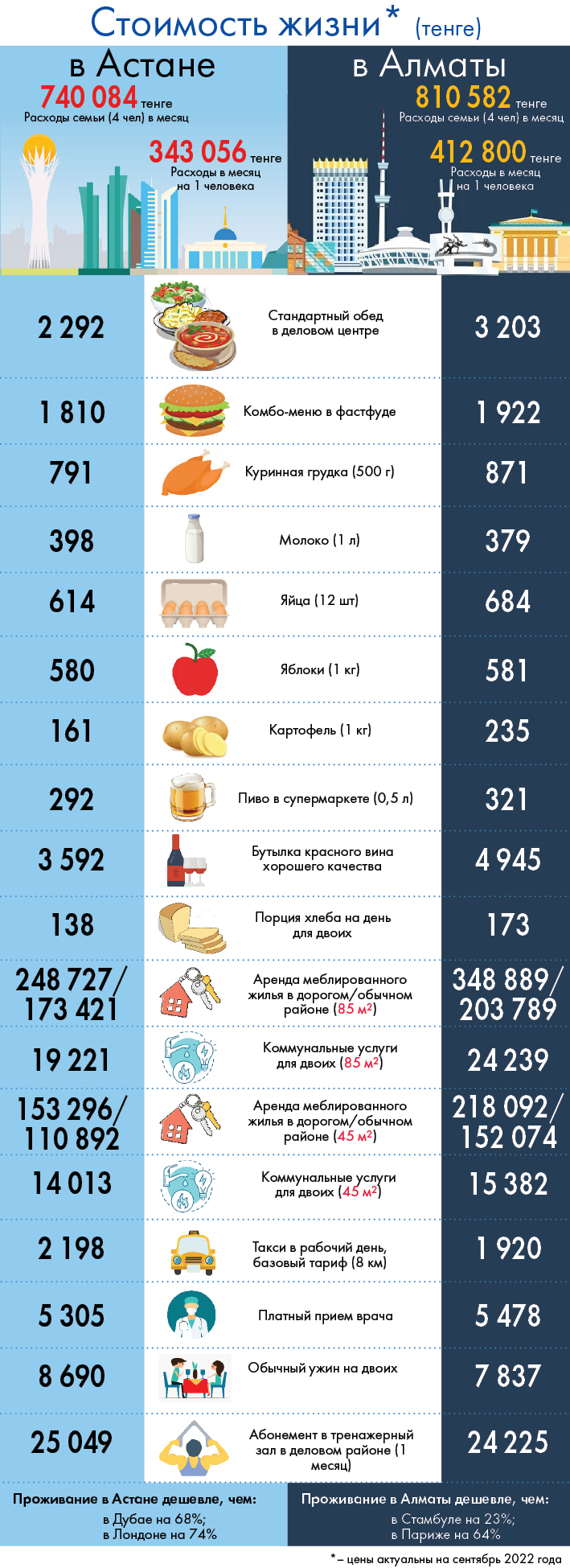 Caravan.kz предлагает сравнительную инфографику о стоимости жизни в этих городах.