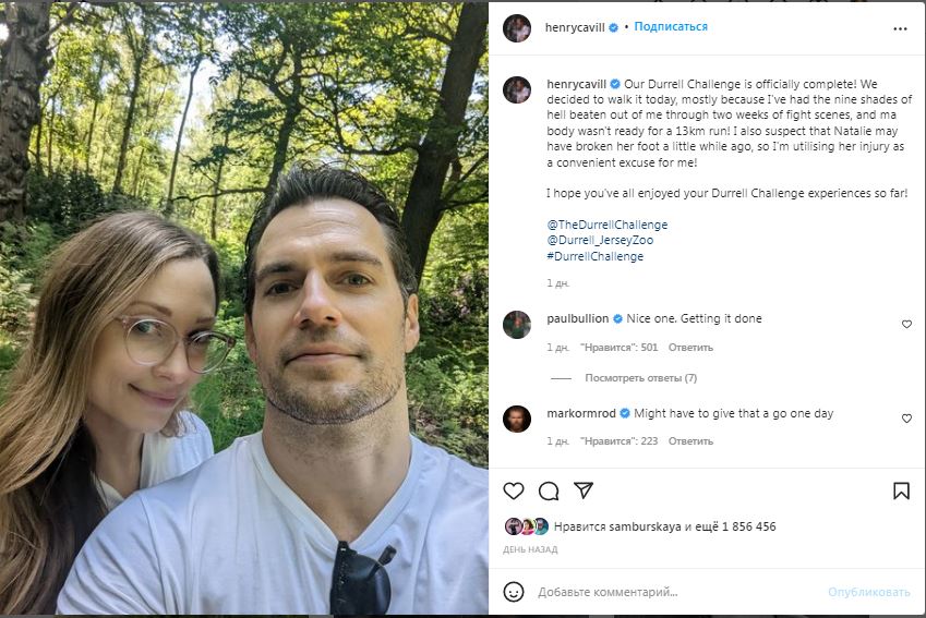 Сейчас страсти в его блоге поутихли, и Генри снова решил поделиться снимком с любимой. Судя по подписи к посту, пара вместе участвовала в длительном забеге по пересеченной местности.