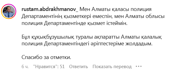 — Я не являюсь сотрудником Департамента полиции Алматы, я несу службу в Департаменте полиции Алматинской области. Я сообщил об этом правонарушителе коллегам из департамента полиции Алматы. Спасибо за отметки, — написал он.