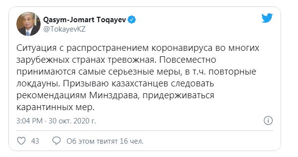 — Ситуация с распространением коронавируса во многих зарубежных странах тревожная. Повсеместно принимаются самые серьезные меры, в том числе повторные локдауны. Призываю казахстанцев следовать рекомендациям минздрава, придерживаться карантинных мер, — написал он в "Твиттере".