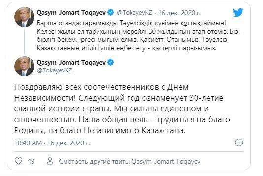 — Поздравляю всех соотечественников с Днем Независимости! Следующий год ознаменует 30-летие славной истории страны. Мы сильны единством и сплоченностью. Наша общая цель – трудиться на благо Родины, на благо Независимого Казахстана, — написал глава государства на своей странице в twitter.