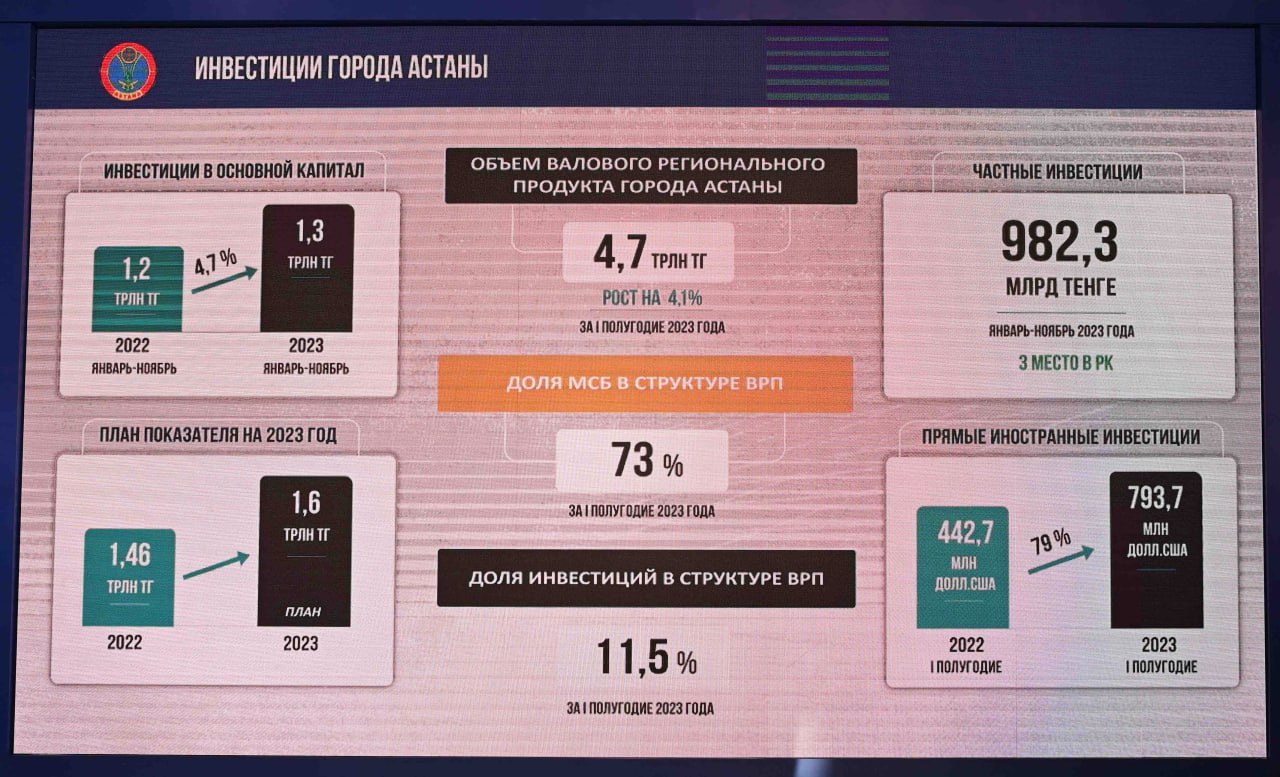 Как доложил заместитель акима города Евгений Глотов, объем валового регионального продукта столицы за первое полугодие составил 4,7 трлн тенге с ростом на 4,1 %. В структуру ВРП основной вклад вносит малый и средний бизнес, доля которого составляет более 73 %, доля инвестиций в ВРП составляет 11,5 %.