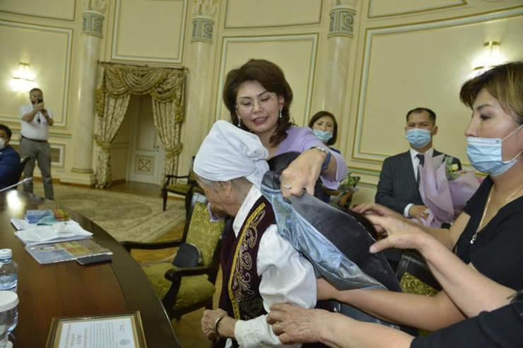 В свою очередь Ханымбуби Акжолова, поблагодарив за теплые поздравления Главу государства, направила Президенту один экземпляр новой книги "Бір ғасыр биігінде".