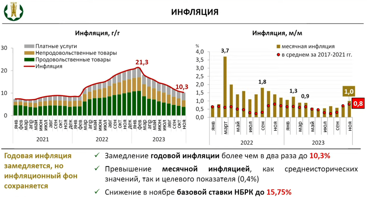 Темпы годовой инфляции замедлились более чем в два раза. На данный момент этот показатель составляет 10,3 %. Однако инфляционный фон сохраняется, месячная инфляция превысила как целевые показатели, так и среднеисторические значения, на 0,4 %.