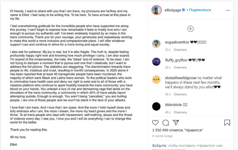 Эллиот Пейдж объявил о своем решении в Instagram.