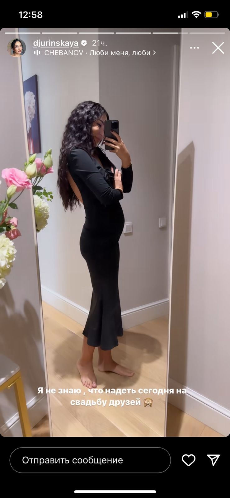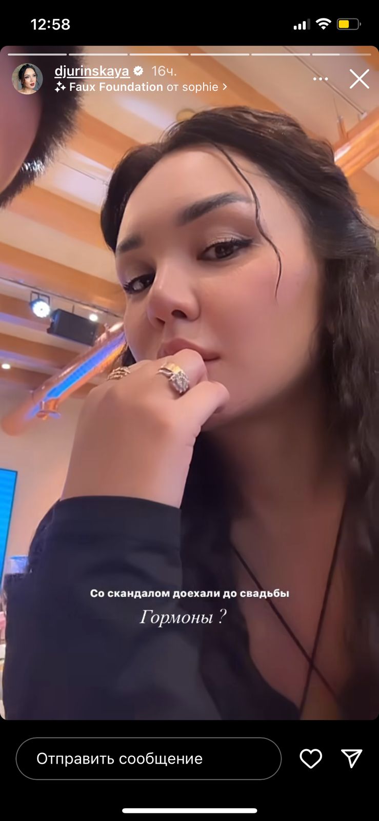 И еще одним намеком на интересное положение стал сториз, где Джуриснкая написала, что пока она с супругом добиралась до мероприятия — успели поругаться, и возможно в этом виноваты гормоны: «Со скандалом доехали до свадьбы. Гормоны?».