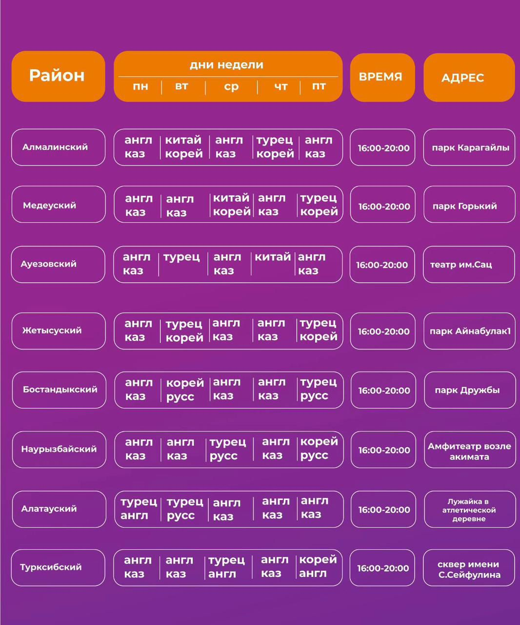 Лингвистический проект «Парк языков» охватывает все 8 районов мегаполиса, где обучение проводится на открытом воздухе в крупных парках Алматы.
