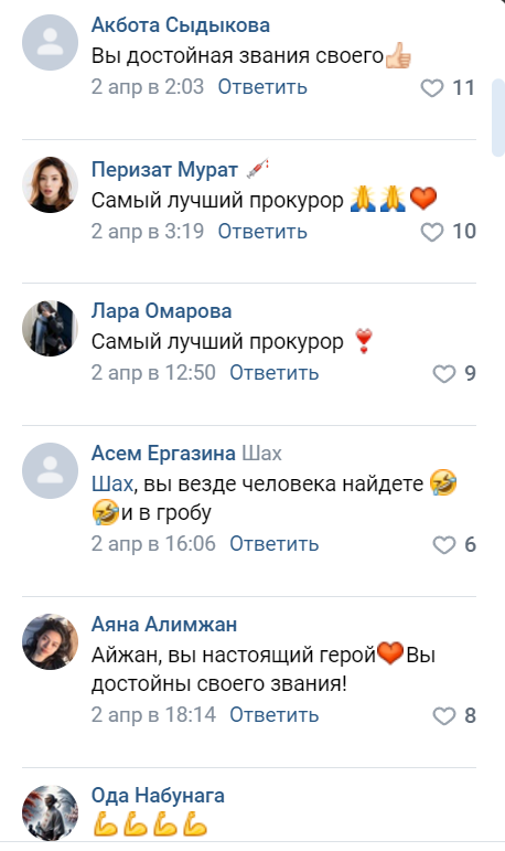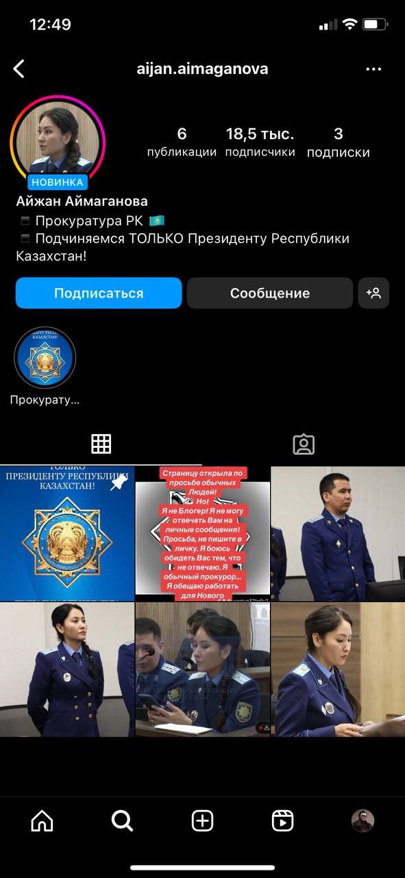 «Дорогие казахстанцы! Страницу открыла по просьбе обычных Людей! Но! Я не блогер! Я не могу отвечать Вам на личные сообщения! Просьба, не пишите в личку. Я боюсь обидеть Вас тем, что не отвечаю. Я обычный прокурор… Я обещаю работать для Нового Казахстана!» — говорится в публикации.