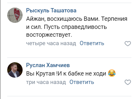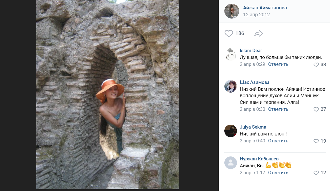На свою страницу в соцсети ВКонтакте Аймаганова не заходила с 2015 года, а под единственной публикацией с фото пользователи оставляют слова восхищения и поддержки.