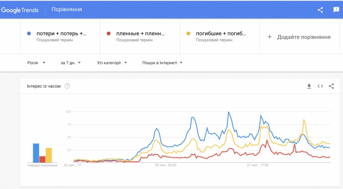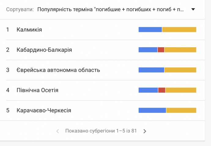 Больше всего ищут по запросу "погибшие" в Калмыкии, Кабардино-Балкарии, Еврейской автономной области, Северной Осетии, Карачаево-Черкесии, Алтае, Тыве, Ингушетии, Ставропольском крае, Псковской области, Амурской области, Курской, Костромской области, Адыгее, Кемеровской области, Алтайском крае, Дагестане, Волгоградской области, Краснодарском крае, Ростовской области, Мордовии и Коми, сообщала "Украинская правда".
