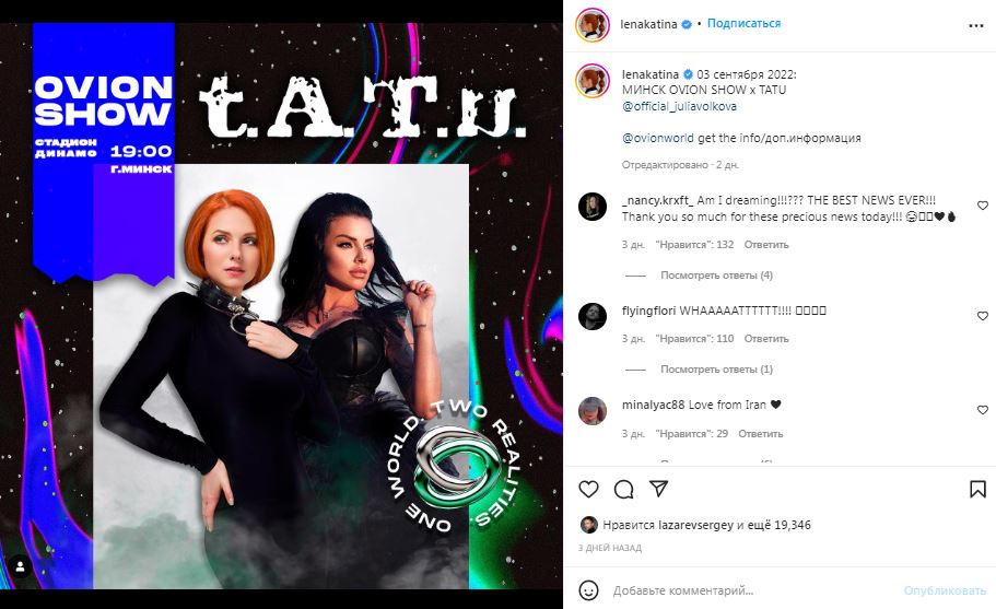 Вместе с Юлией Волковой они примут участие в Ovion Show 3 сентября 2022 года, пишет РИА Новости