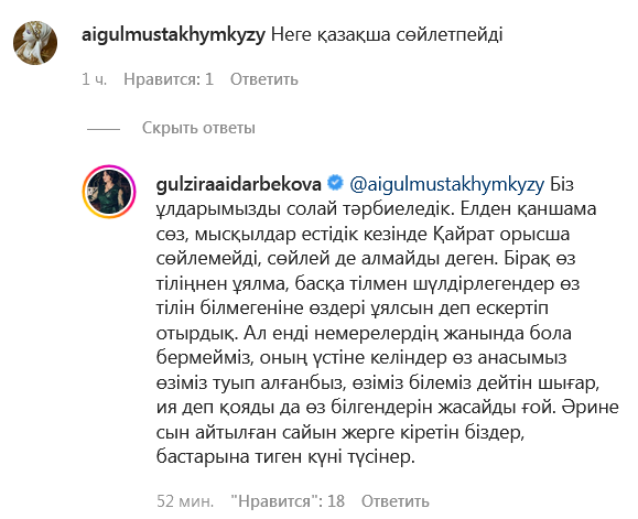 Хотя большинство комментаторов умилилось и отметило семейное сходство бабушки и внуков, нашлись и те, кто раскритиковал детей за русскую речь. Гульзира Айдарбекова резко ответила на один такой комментарий.