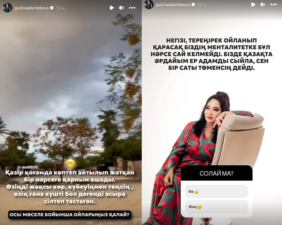 В принципе, если подумать получше, эти вещи не соответствуют нашему менталитету. У нас, казахов, принято говорить: уважай мужчину, женщина на ступень ниже", — написала Гульзира Айдарбекова.