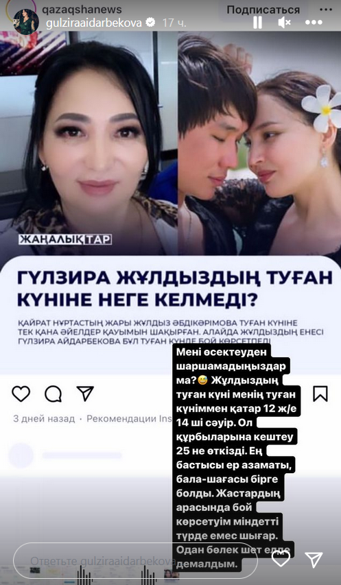 "Вы еще не устали от этих сплетен? День рождения Жулдыз идет подряд после моего, 12 и 14 апреля соответственно. 25 апреля она устроила вечер для своих подруг. Главное, что с ней были ее муж и дети. Не думаю, что мне было бы уместно появляться там среди молодежи. В это время я отдыхала за границей", — заявила мать Кайрата Нуртаса.