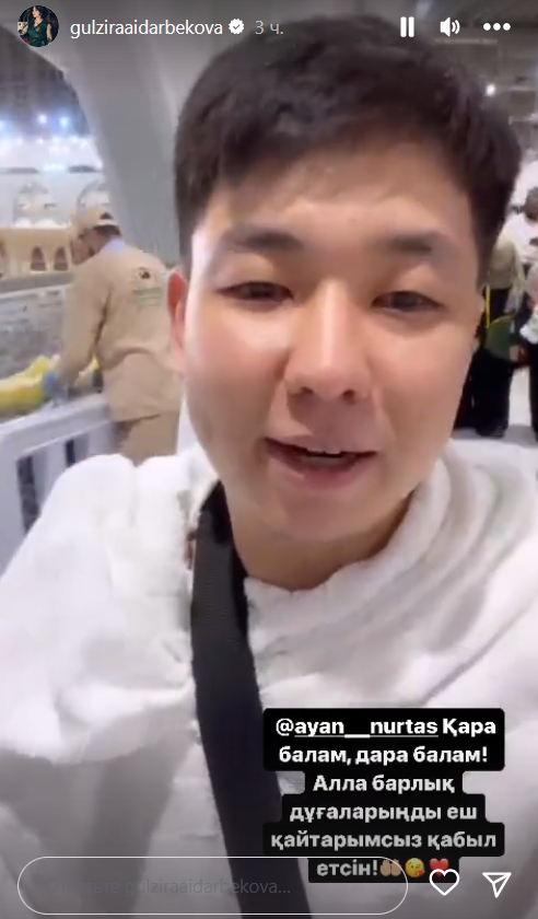 Также Гульзиру Айдарбекову поздравил средний сын Аян Нуртас, который на данный момент находится в Мекке.