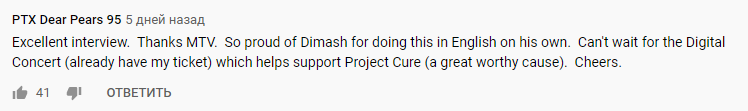 Отвечая на вопрос о фанатах, Димаш сказал, что все они дороги ему, как семья. Вспоминая о своем детстве, певец рассказал, как мечтал услышать казахскую песню на американском музыкальном канале. И он был счастлив, что этой песней стала Qairan Elim. Говоря о будущем, Димаш поделился планами продолжить свое мировое турне «Арнау» и включить в него еще несколько стран.