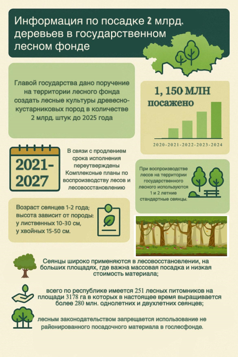 В 2021-2024 годы всего по республике посажено 1 млрд. 150 млн. деревьев, пишет Caravan.kz со ссылкой на сайт Министерства экологии и природных ресурсов РК.
