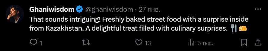 Звучит интригующе. Свежевыпеченная уличная еда с сюрпризом внутри от Казахстана. Восхитительное удовольствие, наполненное кулинарными сюрпризами, — написал Ghaniwisdom.