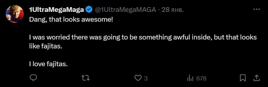 Вау, это выглядит шикарно. Я переживал, что внутри будет что-то отвратительное, но еда похожа на фахитас, а я люблю фахитас, — написал 1UltraMegaMaga.